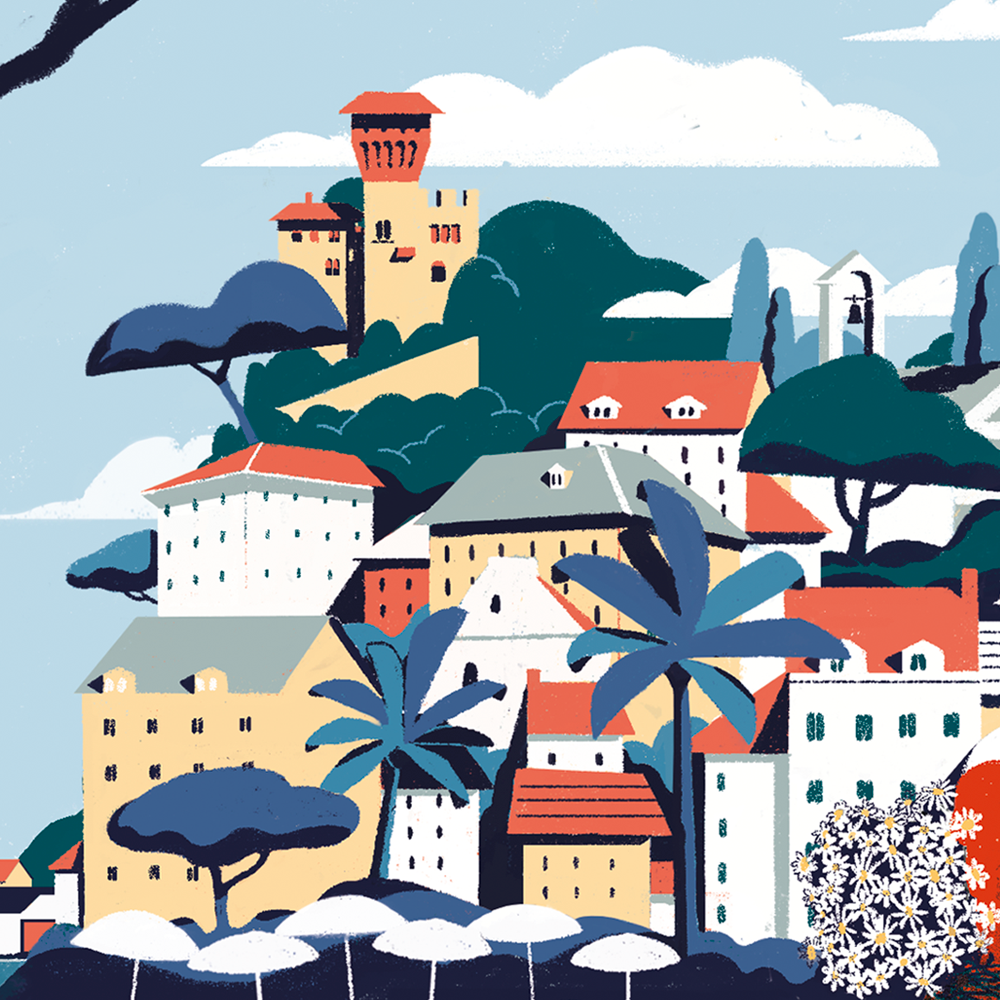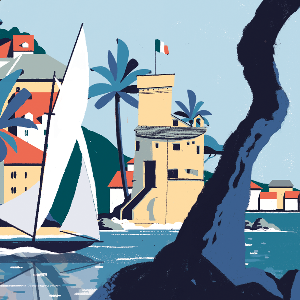 Illustration made for a limited edition of bottles by Acqua San Bernardo about a few famous hotspots of Ligurian Riviera.